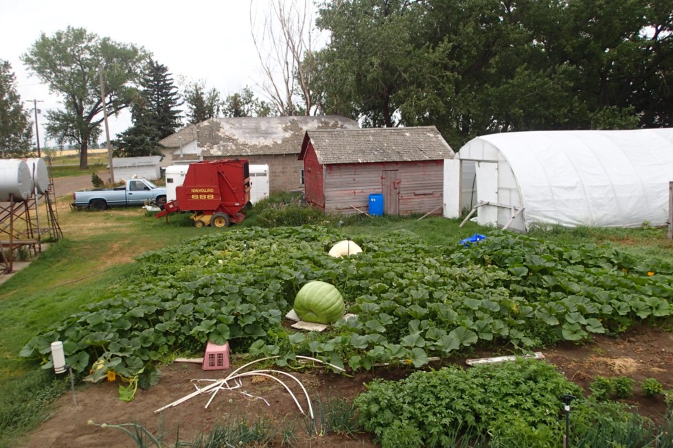 An overhead shot of the farm patch. The two plants have filled up our side of the garden.