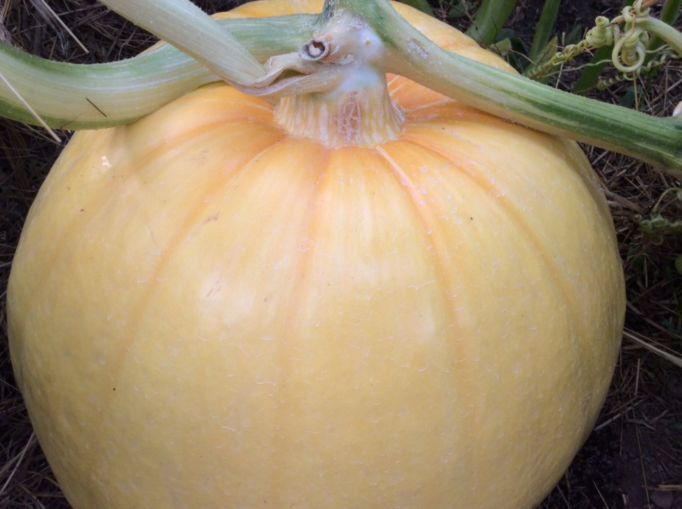 811.5 Schweigert. If you grow blossom down the upward growing pumpkin can kink the vine. The vine angle down to the pumpkin was very high on this one which makes it more prone to kinking later because the vine would have to be raised more to keep that high angle. The lowest angle that allows the vine to avoid the sides of the pumpkin would best? With a long stemmed pumpkin hanging down 90 degrees might work but a shorter stemmed one like this one... Well it's got to be angled down. This vine going into the pumpkin was angled down too steeply though and it kinked as the pumpkin grew up.