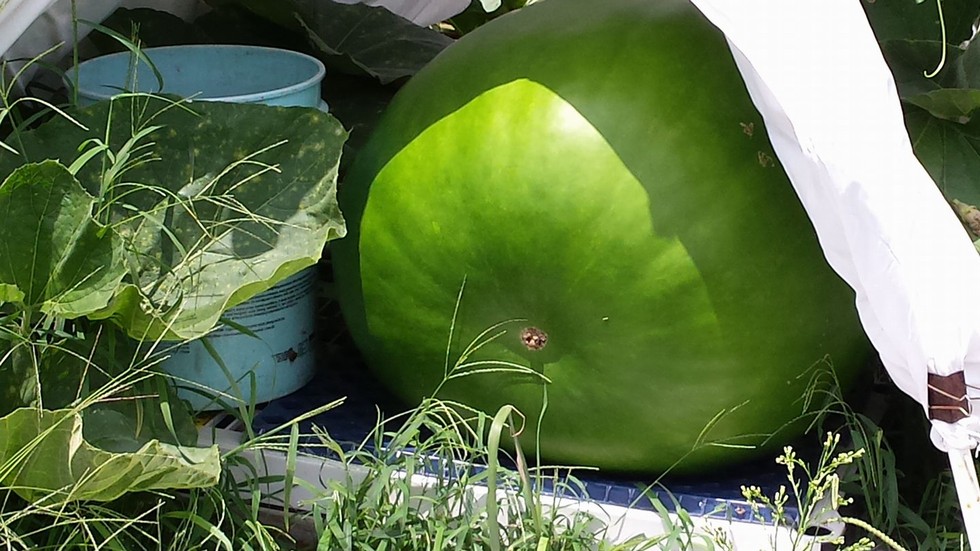279 English bushel gourd. Just beautiful. And big. Pictures doesn't show the true size. I put a five gallon bucket for scale hoping it adds another 100 lbs. Dap 33 today