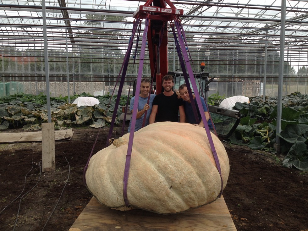 Our 1949 was lifted and Stuart hauled it all the way to Holland only to find that the blossom end had split. It had either happened on the way over or before and we didn't notice it. However all was not lost because she got weighed at 1944lbs DMG and Stuart and Kaz had a great time. DAP 101 our 2624is up 21lbs and 2255lbs DAP 91 our 1949 is up 39lbs and 1977lbs DAP 80 our 2157 is up 39lbs and 1719lbs The 2252 is quite happy sat in the patch at 1788lbs Pollinating early so your pumpkins are growing through the longest days is the way to go.