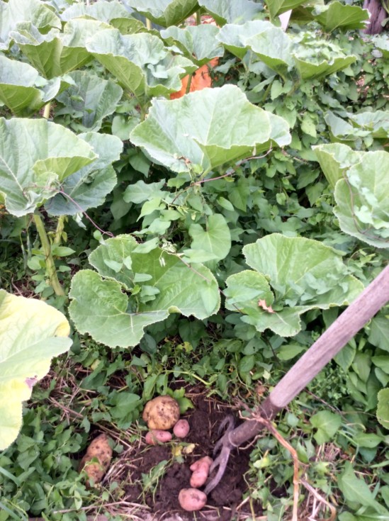 Potatoes. The 811.5 did grow over the potato vines and the potatoes were not a huge problem. They did not compete for light, and possibly they suppressed other weeds but overall there was not as much compatibility as I was hoping for. A small farm could do well to make a later planting of field pumpkins or ornamental gourds in late June or July and these could grow out over nearby rows of potatoes if an October harvest was acceptable for both this might work well.