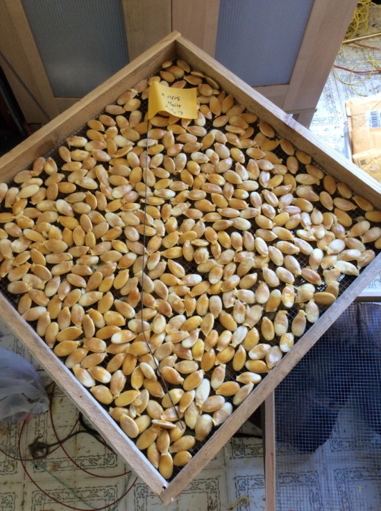 1462 Gibson x 1415 Haist. The Haist started white and is pink/yellow now. Most if not all of these seeds are duds. Only about 30 appear to contain much. Huge seeds not much in most of them. 32 DAP was very early to remove but it was still a good solid pumpkin for three weeks afterward.