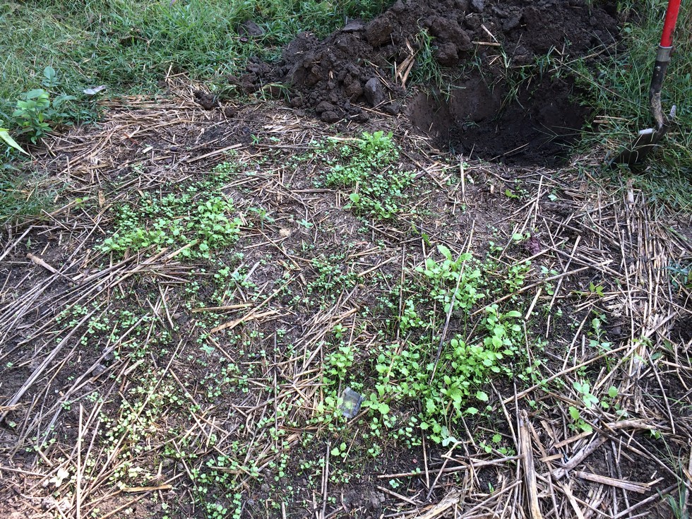 Here is the beginning of my giant tomato area for next year. I dug a hole just past the old compost pile down to the clay level. I dug a little way into the gray clay so I could mix it back with the compost destined for that hole.
