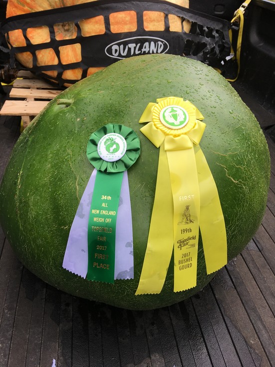 Sweet end to a bad year. I won Topsfield with a 189.5lb bushel gourd. Was hoping for 200. But really happy with that. I have one smaller one for next week but got a win for the first time. Learned a lot this year and hope to come in real strong next year.