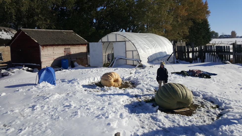 The patch today. We have never picked pumpkins with snow. I was a bit worried we couldn't get into the patch and the overnight low yesterday hit -8 but everything seems to have survived.