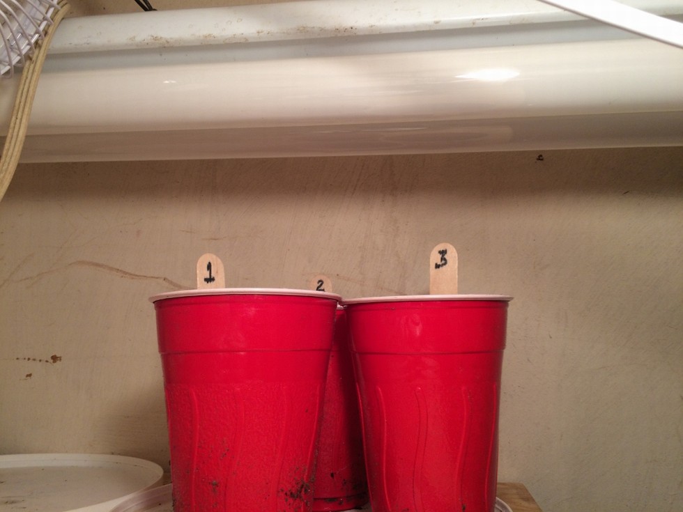 Planted each in a plastic cup with corresponding number labels and drainage holes in the bottom. Using T8 regular fluorescent with one cool white and one plant growing fluorescent tube. Hoping to get a full spectrum mix that way.