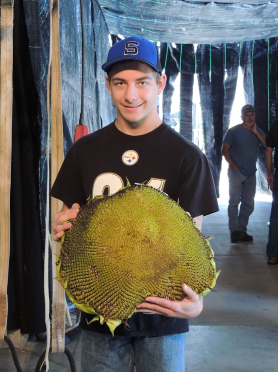 Weigh off time. My son Derrik posing with his new PA record sunflower head of 28.5 inches !