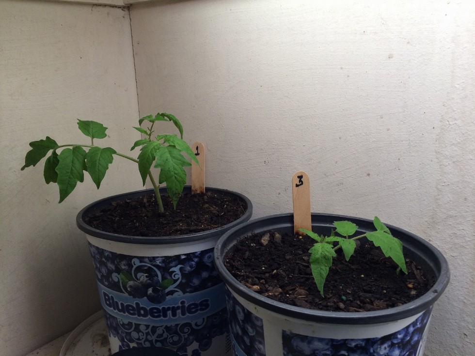 Lost the number 2 seedling soon after germination so am left with #1-7.07 Qualley Big Zac and #3-4.86 Q Tip Big Zac. I transplanted them into a larger intermediate container to try to encourage more root development. Added worm castings and mycorrhizal fungi spores during the transplant process. Used commercial organic soil mix since I was out of my mixed soil for the season.