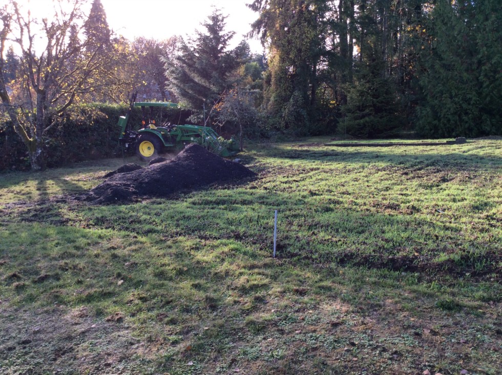 Behind the steaming batch of compost, Mr. John Deere showed up today with a post pounding attachment to set the posts for our pumpkin patch. This is an awesome piece of machinery, but too large for my needs in the garden and patch.