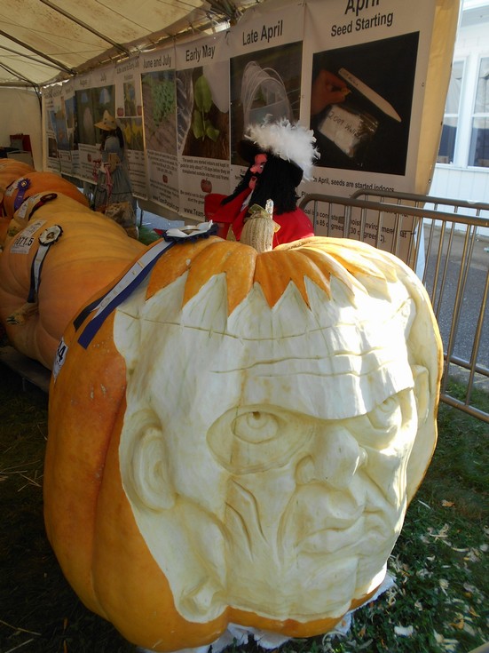 This shows one of the carvings we had along with some of the informational posters we had one display. We often get questions about what goes on during the season to get a giant pumpkin. Each poster represents a key event of the growing season to provide people an idea of what occurs and when during the course of the year. You can see that seed starting in April is the beginning and then in late April there is a cold frame shown.