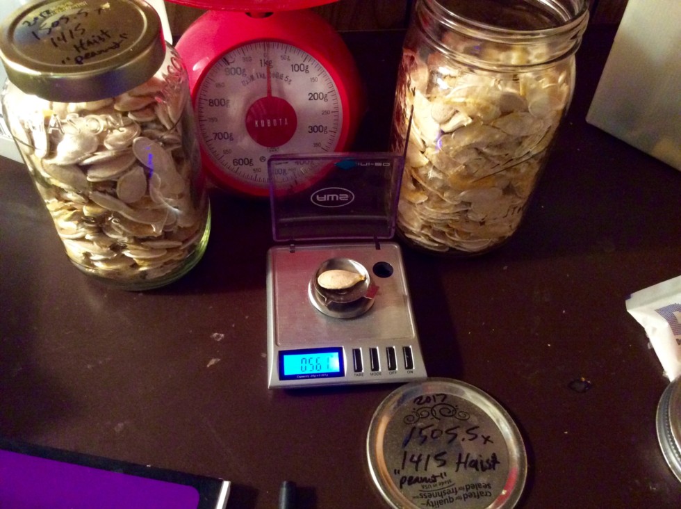 How many seeds in the two jars??? My guess is 900. Anyone else want to take a guess? These all came from one pumpkin, one of my 1505.5 Haist plants from last year. I was pulling the seeds out of this one and I was thinking 'wow is this ever going to end? This one has a lot of seeds...' I will count them and post the result soon!