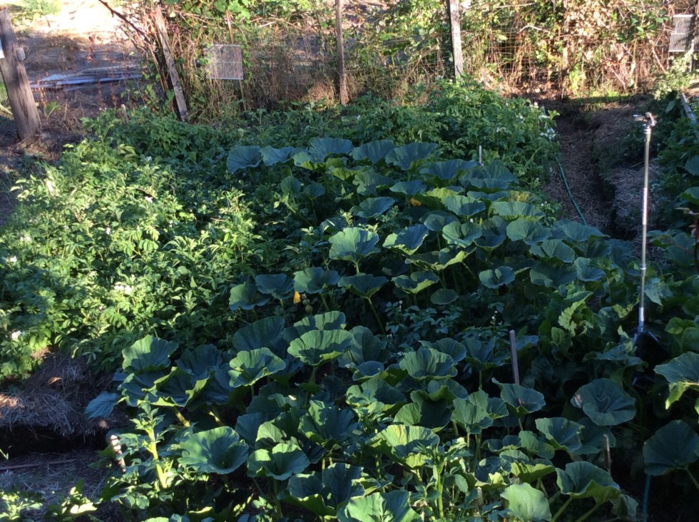 Here is the same patch June 10th last year. (The potatoes were overly dense so it was not a perfect combo, they held the pumpkin vine up too high, but if they were less dense, plus if I added a little more nutrients later in the summer... Well... you get the idea... It could be a great success??)