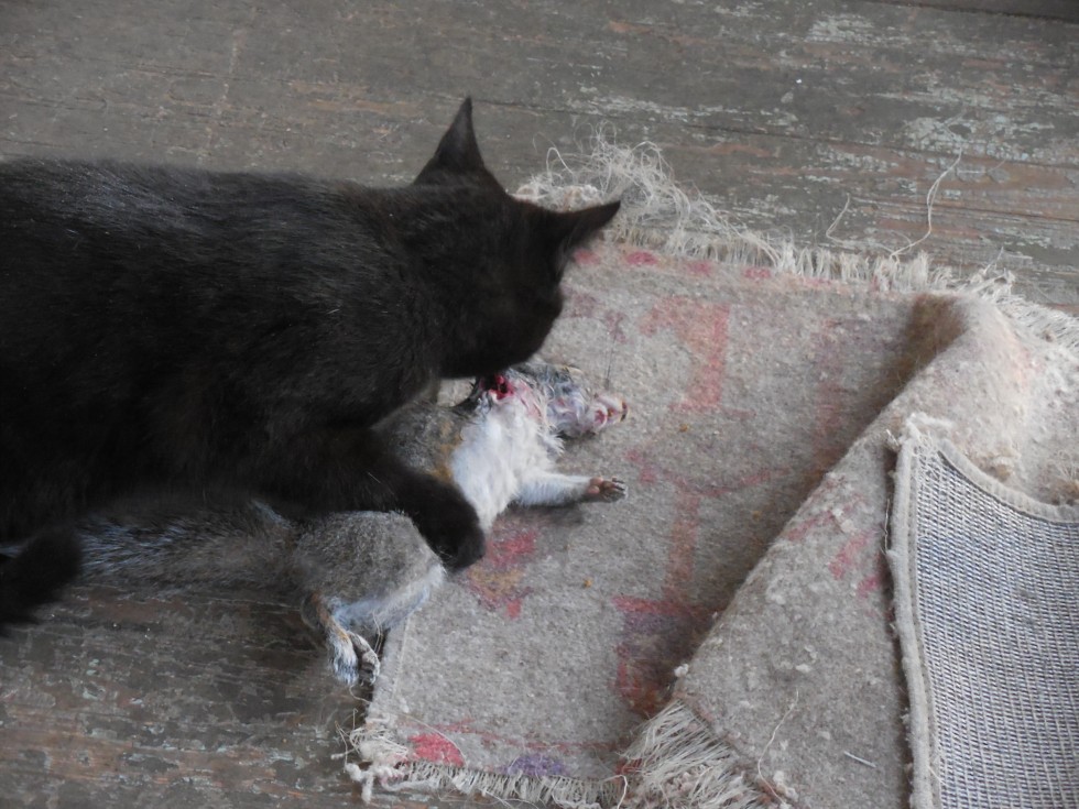The cat and the squirrel...The squirrel make a mistake... We feed the stray cats outside on our back porch.They do a good job taking care of the Rodents.