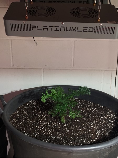 Here is my newest indoor baby. Carrot in 65 gallons coco predominant mix. I will have to think of a name...The last carrot that occupied this spot, Carina was doing really good until she decided to become a momma. Most important change to delay flowering, 2 custom ordered 300 watt LED's with a veg spectrum array (blue light)on all switches. The second plan has been delayed. I tried running 100 feet of stainless tubing around the inside of the pot. The plan was to pump cool water thru the tube to cool the root zone. Unfortunately the tube kinked on me. I will add the cooling tube later on the outside.