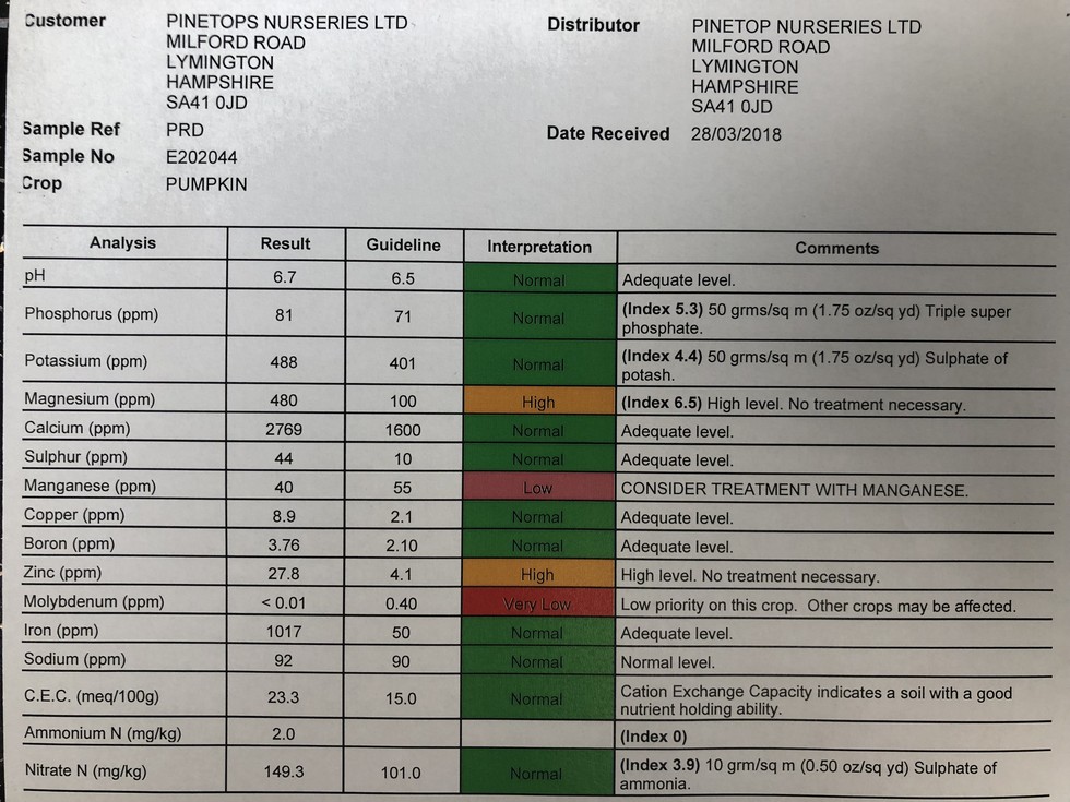 Our first soil sample of the year is looking very good but it may change a little once we add 24 pallets of perlite. As the phosphate will need bumping up over the growing season we will take the opportunity of adding some super phosphate as were about to dig the whole patch again.