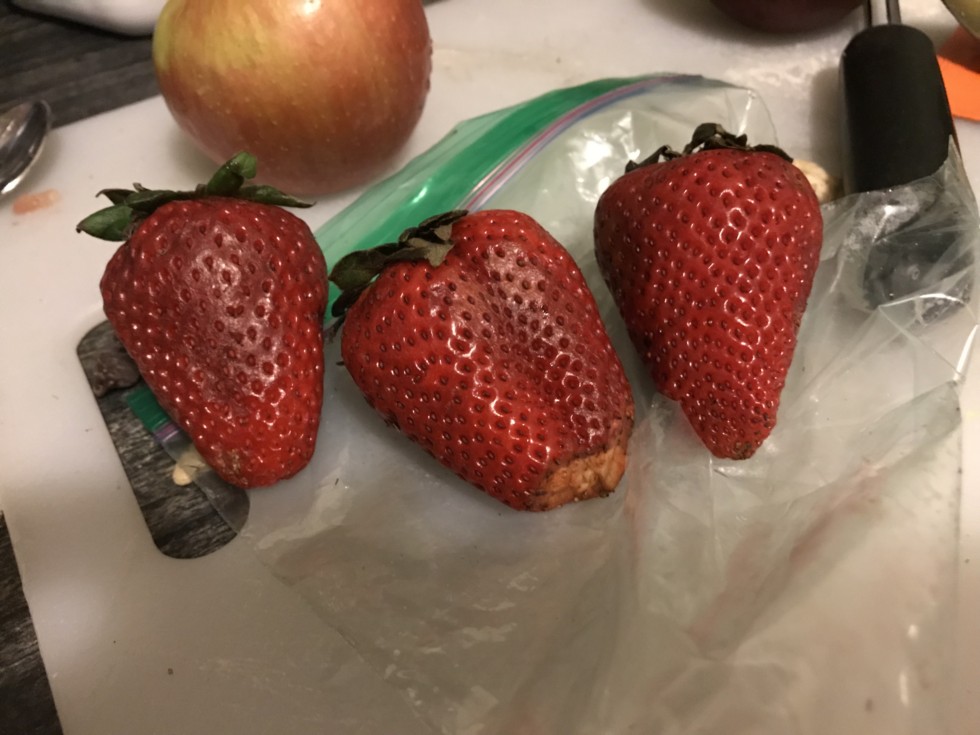 Modern agriculture: god or bad? These strawberries went with my daughter to school. Then they came home. Then they sat in a sandwich bag at room temperature for three days. Then they sat in the fridge for a week. The one in the middle even has a bite out of it. And here they look almost as good as new. There is no rot where the bite mark is. Impressive... now if only California would do a study to see if they cause cancer... They�d have to put that silly label on them.. know the one I�m talking about? :) These must be GMO... But ignorance is bliss.