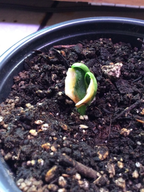 Second year I've saved a seed with rotting cotyledons by removing all of the seed coat, then planting in the "already sprouted" position. For an older, or damaged seed, I think this can really make a difference, because any rot stops when exposed to dry air and sunlight. I think this 1442.5 will make it. 1442.5 is a 20% heavy 1161 Rodonis x 1623.5 Wallace, and I think it's recessive for very good color. I just like the cross, the genetics, and the possibility it will throw a beauty.