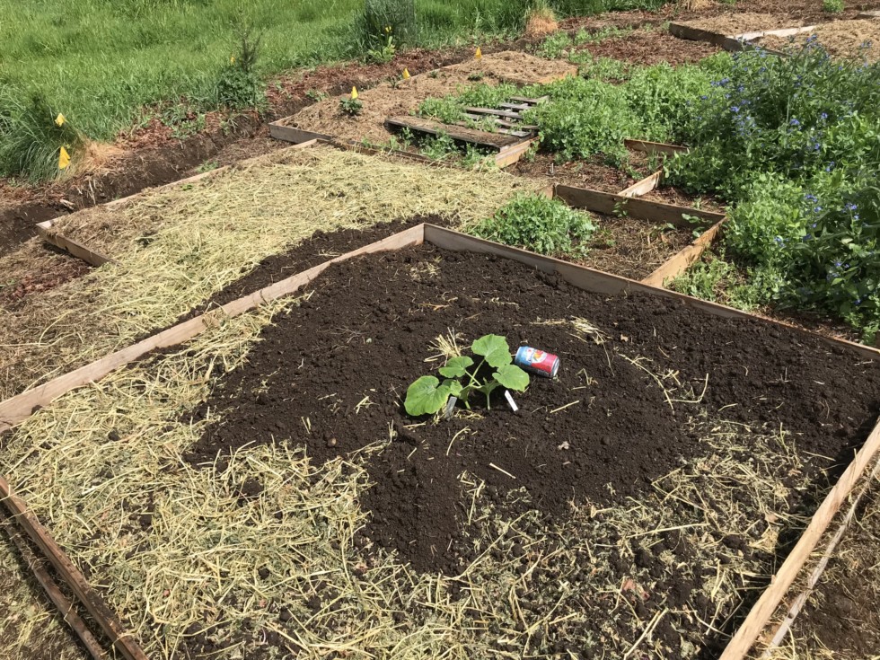 Patch layout from backside. There are three 6x6 squares and four 3x3 squares for a total of 144 sq ft. Just letting the extra six square feet get absorbed into any small gaps or misalignments. Also I might have a minuscule vertical advantage as I�m getting the vine to grow over the pumpkin, so that it will end up blossom-down.