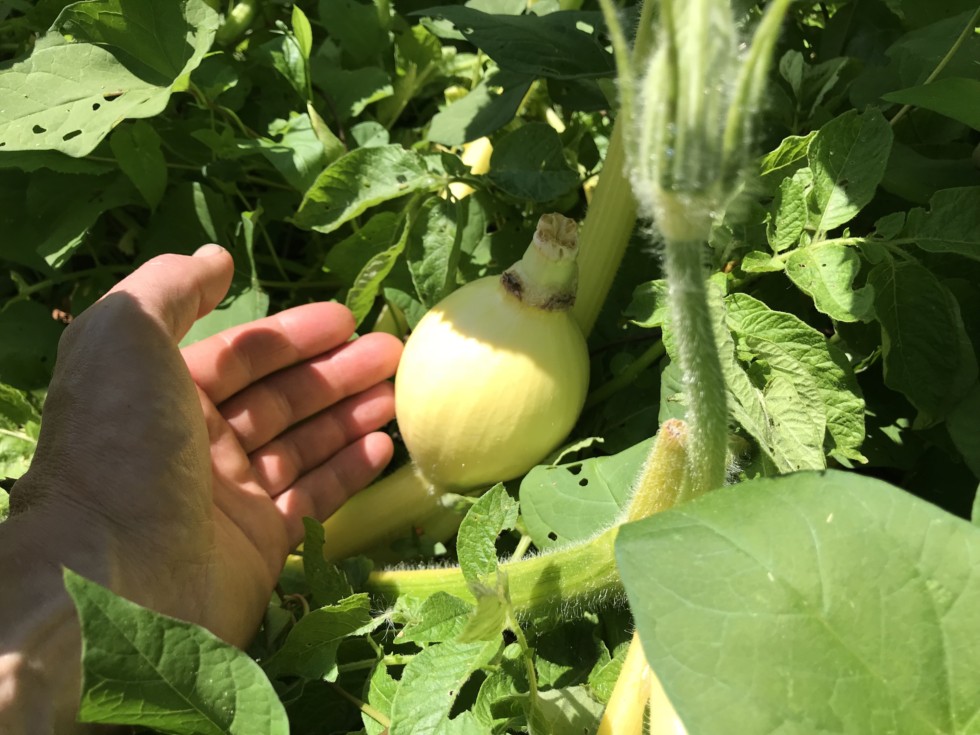 Anna�s 1472.5 Sherwood pollinated on 6/15. This pic is @ 6 DAP. Plant is about 100 sq ft. Not a huge plant but it could still make a personal best. Lots of weeds and potatoes not worried about it though they�ll get smothered with dirt when she buries the vines...??? This worked well last year.