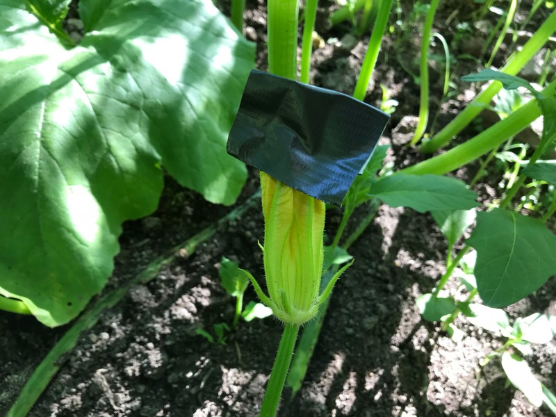I�m still finishing up some late pollinations and wondering if the high temps will cause them to abort There is still time for.a big pumpkin but it is getting late. I found another good use for duct tape to keep the flowers shut.