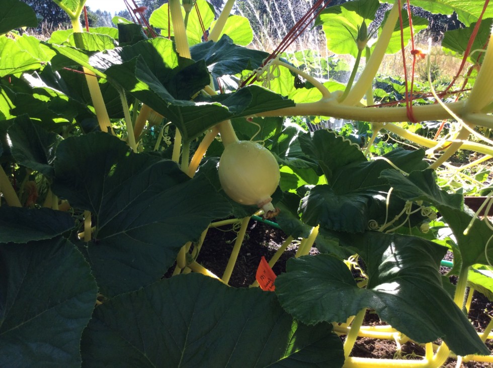 I love blossom down! Here's the easy part... They bend down on their own! No daily adjustments needed... Once the vine is tied up its done. Although if you want to keep all the secondaries they should be tied to avoid the area where the pumpkin will eventually sit. Obviously haven't done a good job of that here:)
