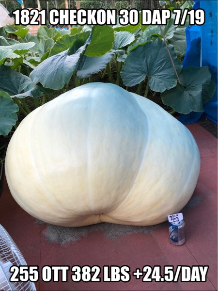 Day 30 today for my 1821 Checkon. Tapes 255 ott for 382 lbs. Gains have slipped off the past two days but I think it�s from the cooler nighttime temps. Plus I could sure use some rain. This is my biggest day 30 ever so I�m happy. A slight bit of orange has showed up on her as well.