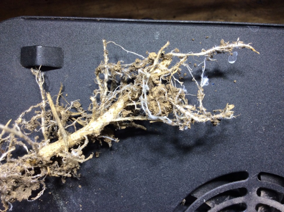 I think I found some myco on the 1297 Holland roots. I used his myco product on this plant. Not sure exactly how much it's helping but it's got one of the bigger pumpkins and the plant is not wilting... Nutritionally the plant is deficient but that may be a separate issue. This was a taken out of the ground a couple feet from where I originally spread the myco. Maybe it spreads as fast as the roots??? Or maybe I already have myco in my soil... Lots of idk's.