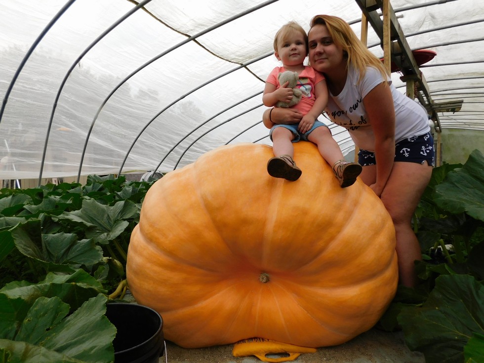 The 2043 Clementz with Baby Bubbles Macy Rae! Day 42 # 2 Pumpkin at 500 lbs this one at 870 lbs estimated . 2 on 1 plant