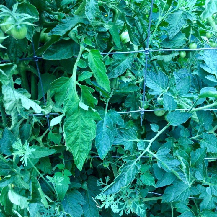 You would think there was a nutritional difference here... But these plants are next to each other and the roots surely overlap. The difference here is one is a healthy cherry tomato (right) and the other (left) is a virus infected "big" tomato plant. Apparently it's hard to accurately tell what sick plants really need, nutritionally... The nutrients for "green" are available but the sick plant can't get them??