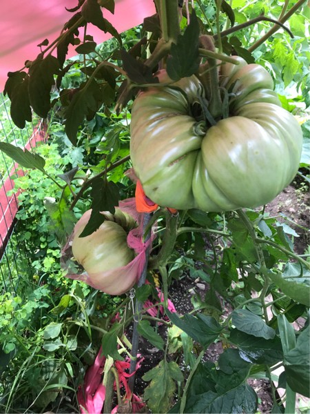 Getting closer to weighing a tomato for team 24. The monsoons did some leaf damage to tomato ally at the patch at my moms house. I couldn�t resist leaving 2 go on this plant and I see the lower girl starting to blush. I pruned this one more than most.