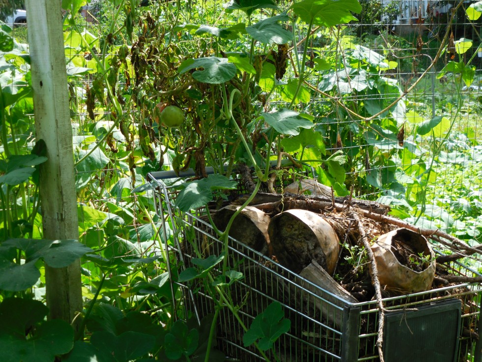 Tomato plant and Dragon gourd growing on the shopping cart. ahahahhahha.....The seeds voluntered in the weed pile in the shopping cart.Instead of transplanting,we wheeled the shopping cart over to the trellis. : )