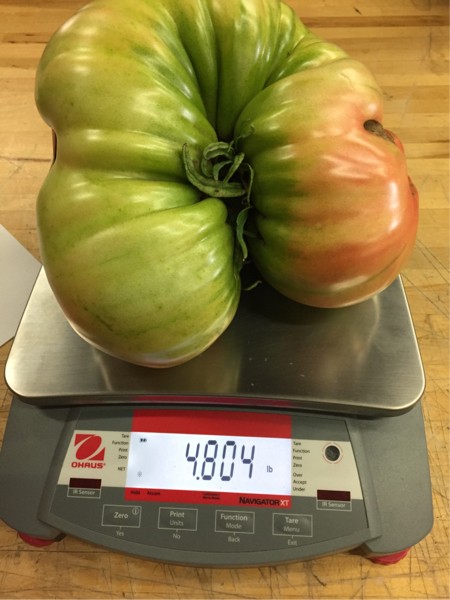 Had an enjoyable time weighing tomatoes with Wile Coyote. The first one I weighed was an F3 Wixom Slammer grown from my 3.02. It came in a bit heavier than I expected at 4.80 pounds. I am guessing the next generation will be in my garden again next summer.