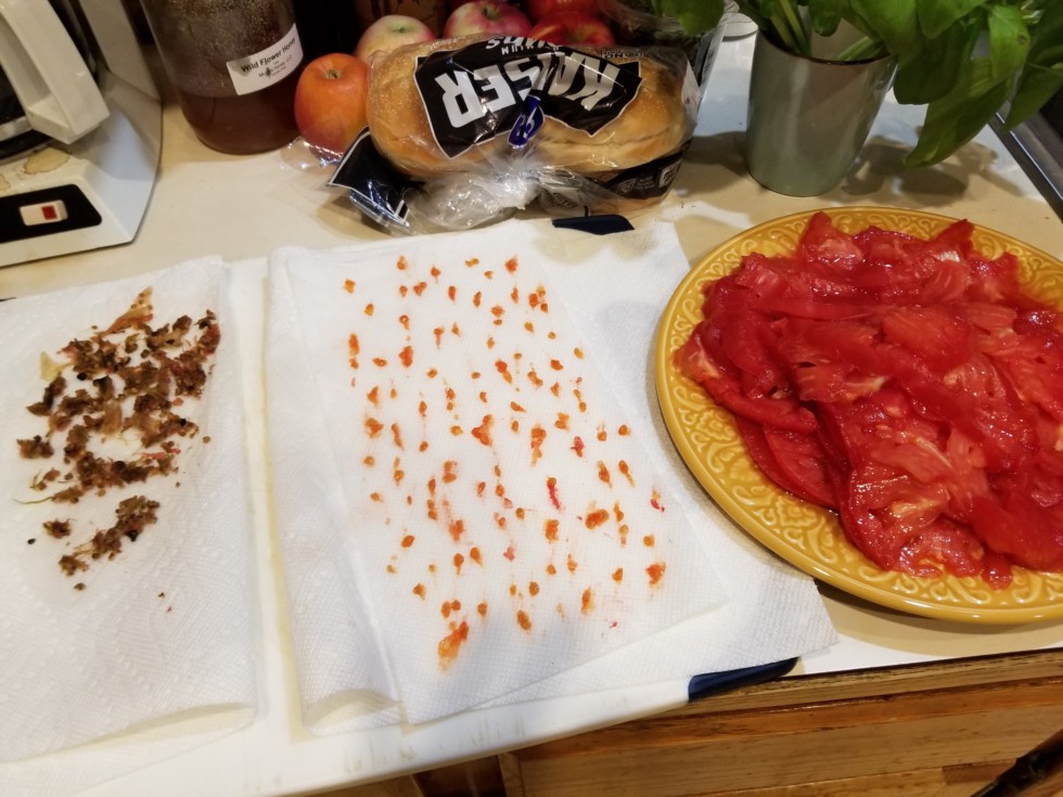 Pic will prob. be upside down. Saving seeds from the 8.22. One is via ferment the other thin slicing and picking. Tedious. But these domingos really pulled their weight. My expensive-seeded hybrid momotaro tomatoes are running and hiding... they have been put to shame by the 8.22 and by Anna's 4.80 Strickler plants.