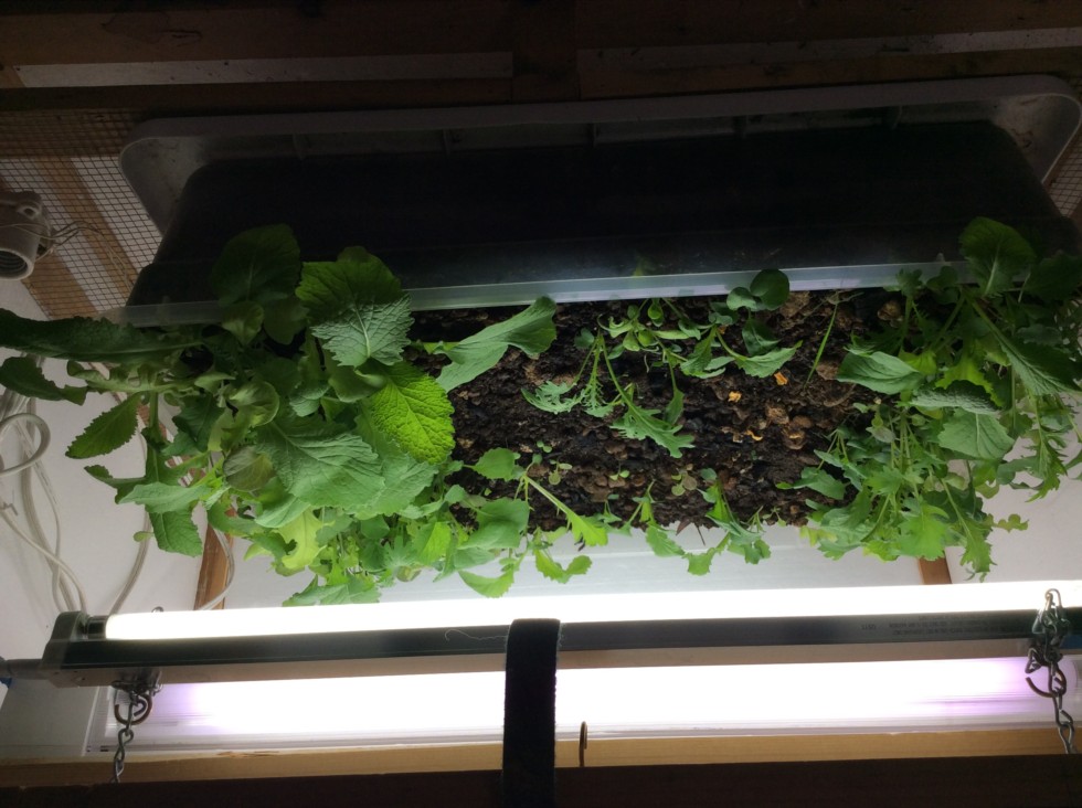 There should be a tomato plant here but instead it's mostly lettuce. I poked one of Anna's 5.01's into the ground to restart my winter grow since everything in the middle got toasted. It did germinate... saw it coming up today but I don't think I can grow a winning tomato in just 90 days... So I concede. Not meant to be. Fun though... Harvested one "free" salad so far.