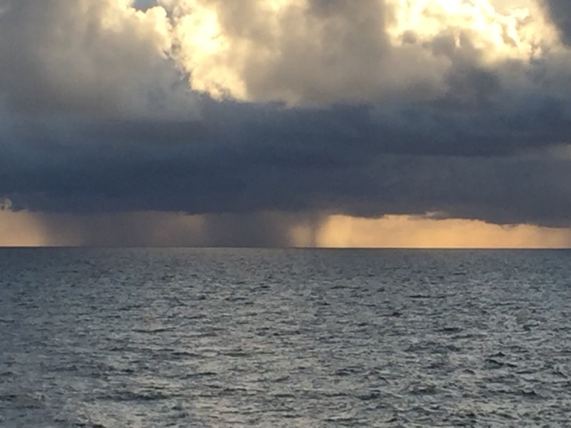 We are rather distant but there is a storm & on the right there is a linear form that I believe represents a waterspout.