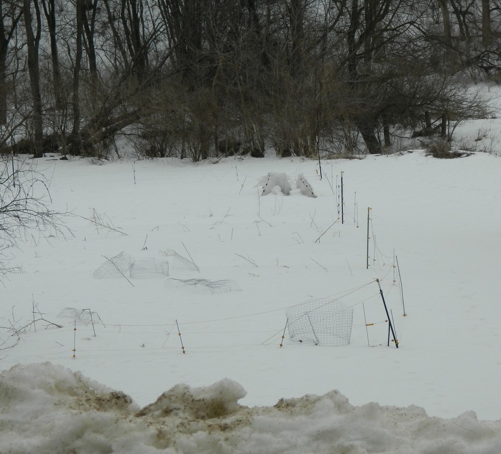 Our pumpkin patch this morning. That snow is over a foot deep and the consistency of a glacier, having been rained on and frozen. It has been hard on the hoop house I left up over winter for our early state fair pumpkin. It had a lot of leaves in it, and bags of wood mulch around the outside, so hopefully the frost didn't go too deep. Forecast for the next 2 days is highs in the 50's and 1" to 2" of rain, so most of the snow should be gone soon. Just as soon as the snow leaves, the hoops will get new plastic, and the ground around the hoops will get some clear plastic flat on the ground to warm things up. My daughter is teaming with me on this project and we will be growing a 1200 Engel here.