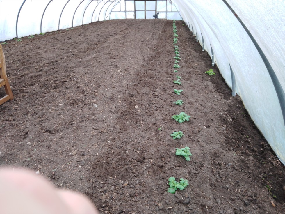 I've put a couple of lines of early potatoes in the poly tunnel, one on each side. Hopefully they will be all gone before the pumpkins require the space. I had the rotovator in here before I planted the potatoes so the manure is nicely worked in to the soil now.