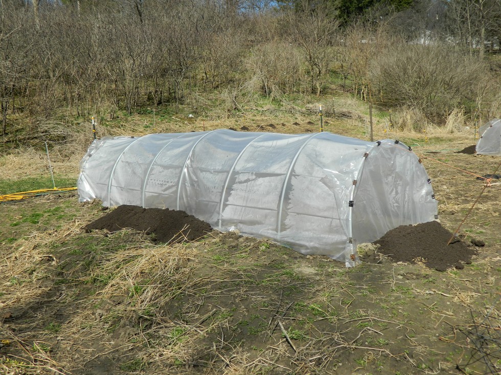 The 6' x 18' hoop house for the watermelons. Jacob put piles of compost around it and I spread them out. After a few weeks of rains leaching the goodies out of the compost and into the soil, we will till it in.