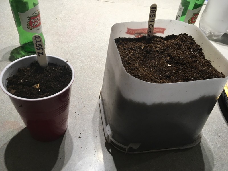 The 2255 hasn�t popped a radicle yet. I err on the side of dryness but my other 1884 planted a day later already has 1� of root showing. Therefore I decided to switch pots. I left the end of the 2255 uncovered so I can watch it.