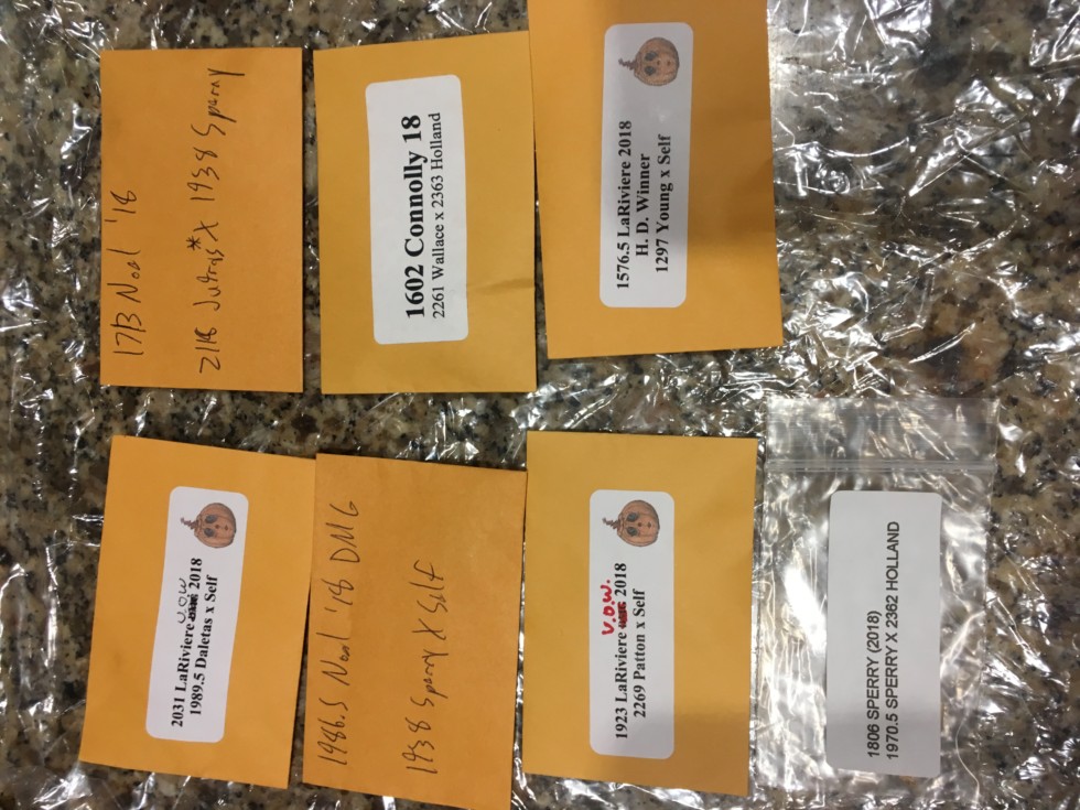 There's a code to understanding what the packets say. The first number is the weight of the pumpkin the seeds came from, then the name of the person who grew it, next is the year it was grown. The next line is the same information about that pumpkins parents.