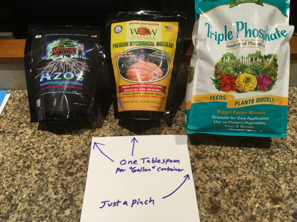 I mixed these in to the Happy Frog potting soil. Azos is supposed to help the roots grow and Mycorrhizal Fungi is supposed to help the roots take nutrients from the soil. Phosphate is also supposed to help the roots grow.