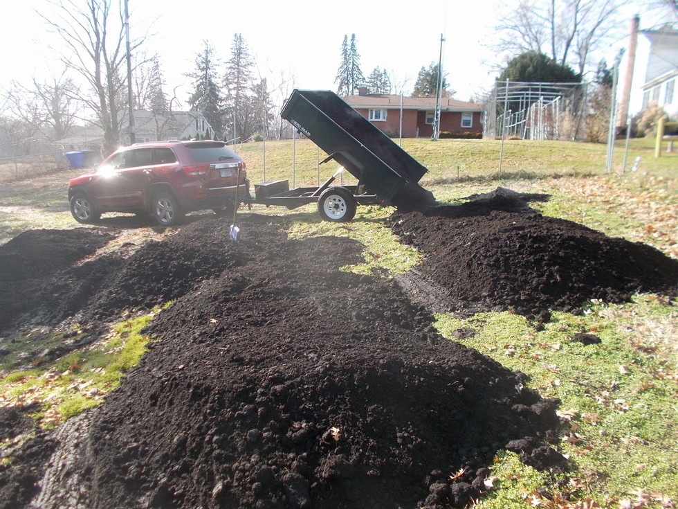 Having a dump trailer made the unloading process very fast and efficient. Each 2 cubic yard pile was selectively placed to ensure even coverage over the two planting sites. The blue snow shovel is plastic and made getting the compost that was adhered to the corners of the trailer easy to dislodge with no damage to the trailer.