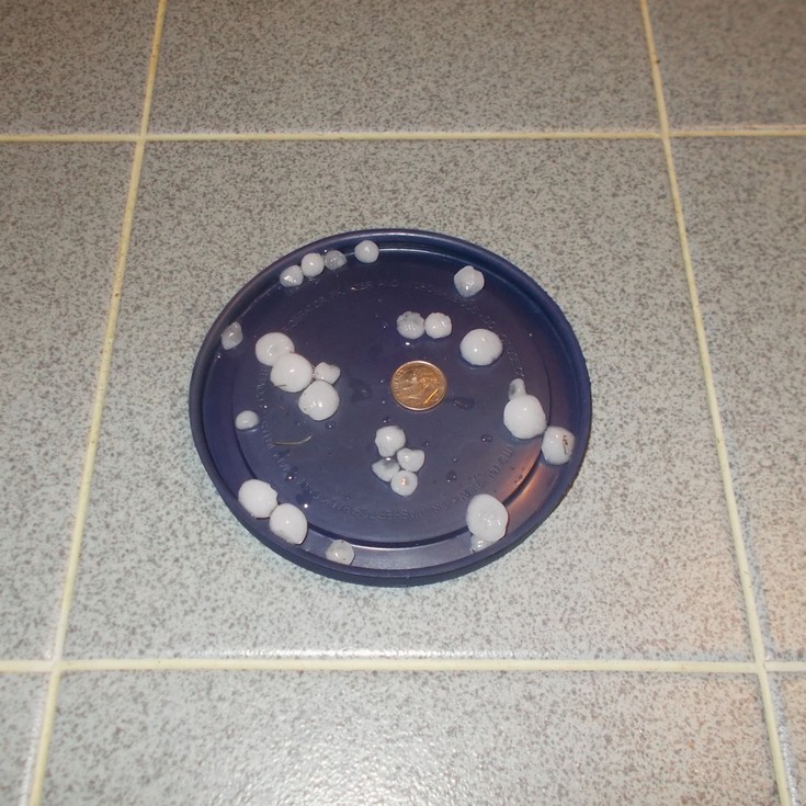 Hail is not very common in the area, and hopefully this storm that produced dime sized hail counts for the season. It melted fast, but this is a sight I do not like to see at any point of the year.