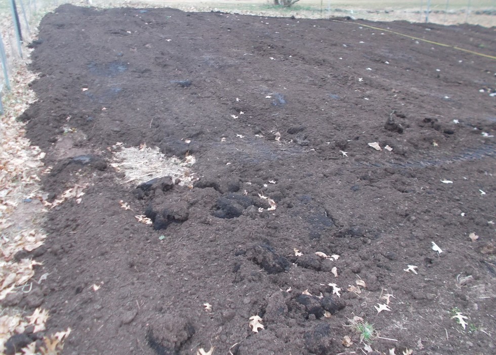 Here is a look at the compost post tractor spreading. It ended up being about 3 inches thick across most of the planned growing area. The yellow rope you see is to mark the division between my two plants as I have something unique planned for one of the plants;-)