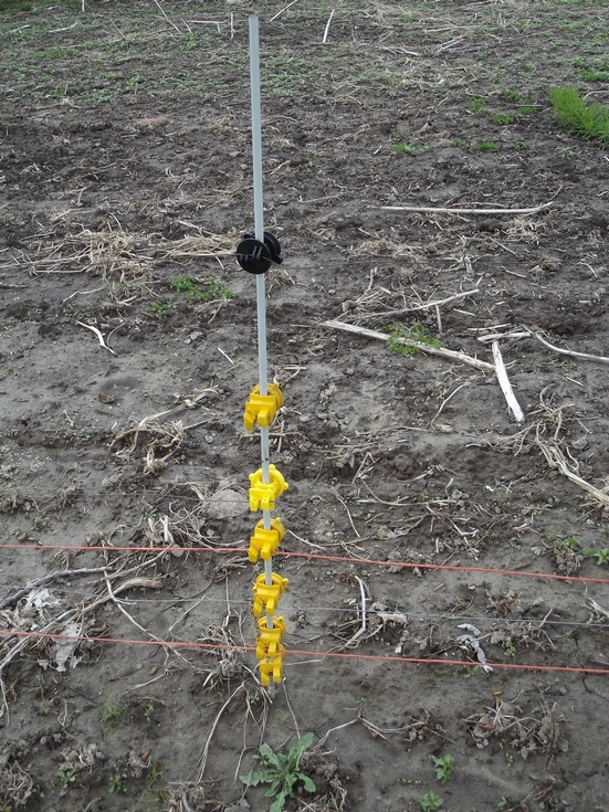 I hope this keeps the rabbits and groundhogs out. 4 hot wires down low with plastic baler twine lines include. I hope the twine forces the critters into the hot wires. The wire on the black insulator is at the height of a deer nose. There ate 2 more strands of baler twine to discourage deer from jumping. I have all of the electric wires in place, just need to string more baler twine.