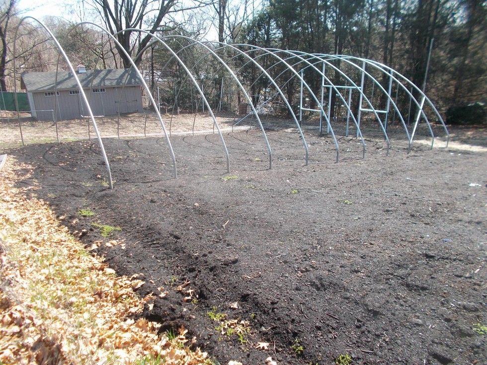 All of the structure hoops are up and work is being done on the end walls. However, this morning the steam off the compost can be seen as it starts to heat up from the sun which has just broken though some early morning clouds. The compost itself was finished and stable; this was simply the high amount of moisture evaporating after a quick change in temperature.