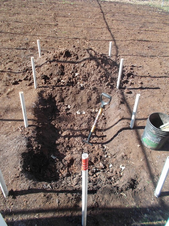 Sometimes the weather dictates when the heating cables should be installed and this was one of those years. The soil was dry enough and the day was relatively warm so today was the installation day. The white pvc pipe marks the side walls to the cold frame which are spaced 5 feet wide and 3 feet from each other in row. Soil in about a 5ft x 6ft area that is 8-10 inches deep is removed and then pitch forked to increase the drainage and aeration.