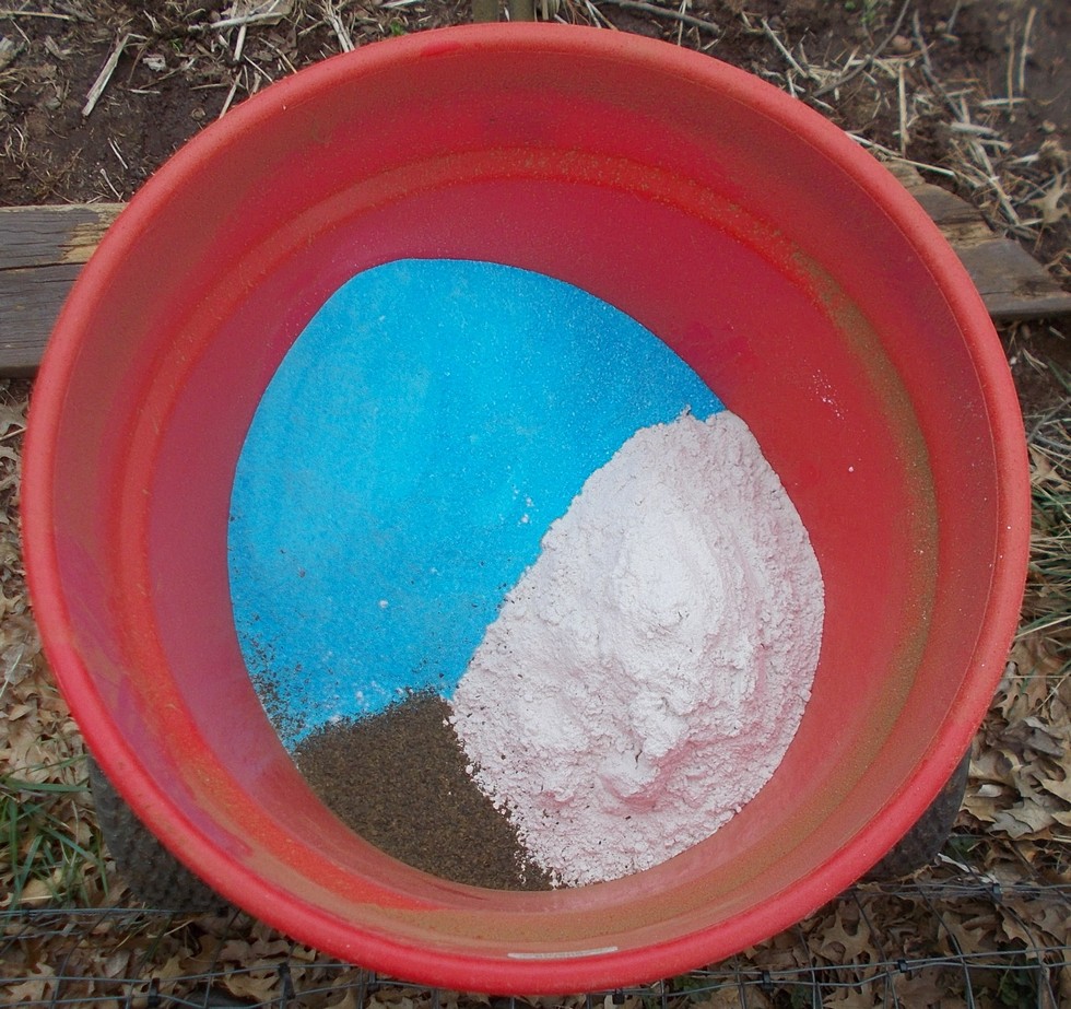 In the image this is my spreader that contains some kelp (brown/tan) in the bottom and then copper sulfate (blue) and manganese sulfate (white). I will hand mix all three of these together and then add in some more kelp which with be further mixed to ensure an even distribution before applying. This does save time and creates a consistent end product distribution.