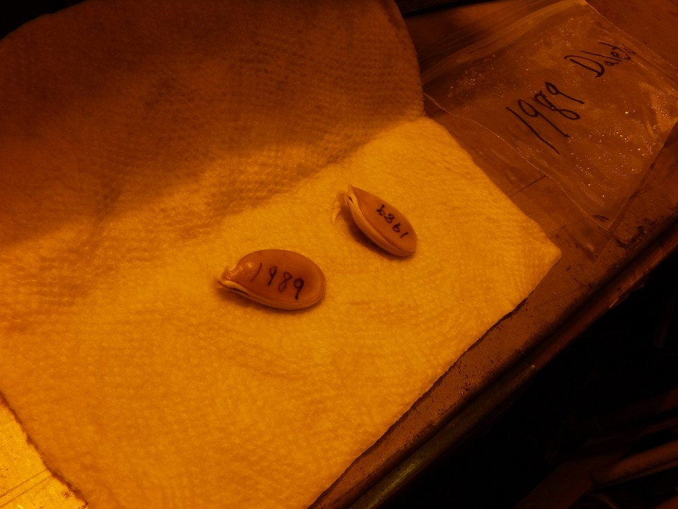 After about 48 hours both 1989.5 dmg Daletas �17 seeds have produced a radical and were placed into planting containers containing Pro-mix BX growing medium. The containers were prepared ahead of time on a seed starting mat and under a HPS (high pressure sodium) grow light, which is why there is an orange tone to the image. A CMH (ceramic metal halide) light would be a preferred choice, but since the seedlings do not spend long inside the HPS works out well.