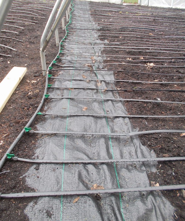 A 3ft wide greenhouse floor/weed barrier has been installed before the main header drip tape to ensure the valves will be easy to access and relatively clean to allow for operation when needed. At the present time each is in the "on" position, to allow for testing and observations. However, there is the option for custom irrigation to best fit the plants needs as the season progresses.